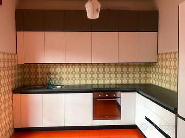 Cucina attrezzata con frigo, freezer, cappa, forno, lavastoviglie e piano cottura ad induzione.
