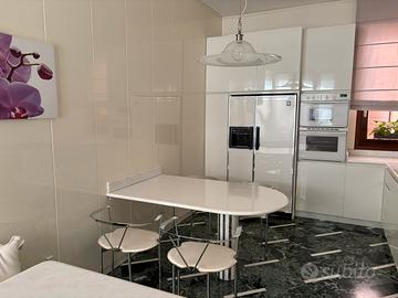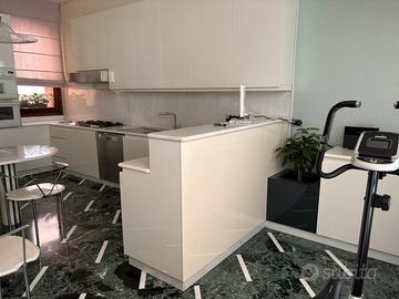 Cucina completa di elettrodomestici in legno laccato in poliestere bianco lucido misure: 300x400cm; top e alzata in marmo scintillante bianco lucido; penisola da 150cm con piano in marmo scintillante e gamba appoggio in marmo scintillante e prealpi verde; 5 sedie fusto inox sedile pelle bianca; Vista e piaciuta - € 2000,00 duemila - * possibilita’ di modifiche - preventivo a parte - di adattare moduli alle vs esigenze.