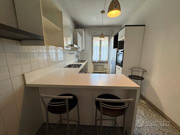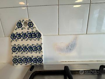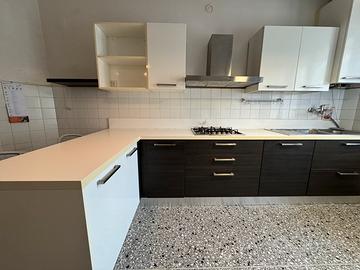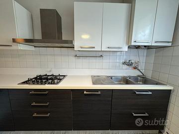 Cucina bianca e color legno scuro, completa di frigorifero e forno, piano cottura e tavolo a penisola. Al momento c’è anche una lavastoviglie ma non funziona benissimo. Tre sgabelli. Il difetto più evidente è una macchia di bruciato sulla spalletta dietro ai fornelli (da ricoprire o cambiare). Il resto è in buone condizioni. Smontaggio e trasporto a carico dell’acquirente.