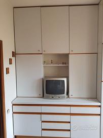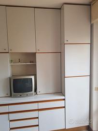 Vendesi blocco cucina e ampio mobile dispensa coordinato, ideali per ottimizzare lo spazio grazie alla notevole altezza. I mobili sono in buone condizioni generali, caratterizzati da un design pulito con finiture bianche e dettagli in legno. 1. Blocco Cucina (Lineare) Misure: Lunghezza 200 cm | Altezza 280 cm. Composizione: Include pensili superiori molto alti (doppio vano), basi sottolavello e vano per piano cottura/forno. Accessori inclusi: Lavello a doppia vasca in acciaio inox con gocciolatoio Elettrodomestici (forno/piano cottura) 2. Mobile Dispensa / Parete Attrezzata Misure: Lunghezza 240 cm | Altezza 300 cm (fino al soffitto). Caratteristiche: Estrema capacità di carico. Composta da numerosi cassettoni, vani chiusi e una nicchia centrale (perfetta per TV o piccoli elettrodomestici come microonde). Il frigorifero è integrato nel mobile. Design coordinato alla cucina per un ambiente uniforme.