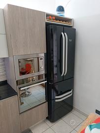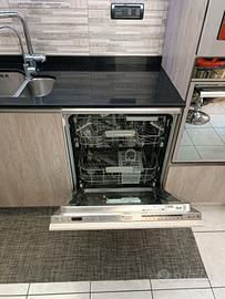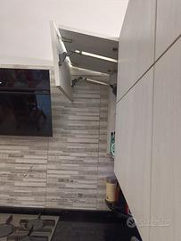 marca Essebi, top in quarzo Starlight 2 cm, ferramenta Blum, elettrodomestici Hotpoint compresi (Frigo libera installazione 70 cm, forno multifunzione touch con pulizia pirolitica, microonde con grill, lavastoviglie, piano cottura gas 5 fuochi), cappa design Elica, lavello Franke, incluso miscelatore con doccetta. Pensili con apertura a libro.