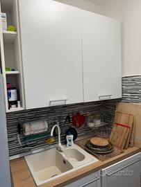 Cucina in perfette condizioni. Formata da una parte da una dispensa da 60 cm. Un Frigo Beko con congelatore da 60 cm. Cassettone da 90 cm con cassetto porta pentole, cassettino porta coperchi e cassetto porta posate. Fornello con sottostante forno Beko sotto da 60 cm e spazio rimanente per recipienti pattume differenziato. La parte di fronte ha uno spazio da 60 cm che contiene lavatrice Beko e spazio rimanente contenente due lavelli (uno grande e uno piccolo). Nello spazio rimanente e stato ricacato un cassetto alto estraibile molto comodo. Sopra tutti i pensili che si vedono in foto.