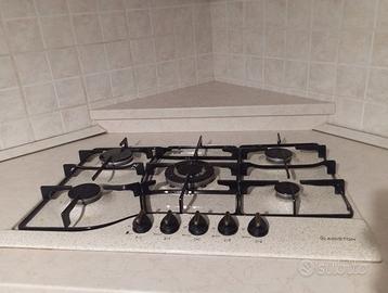Piano cottura angolare: Incassato nel top, presenta 4 o 5 fuochi con estetica in fragranite bianca, abbinata al lavello [1].