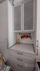 Cucina lineare Ikea completa di fornello, forno, lavello a doppia vasca, rubinetto allungabile con doccetta, lavatrice da incasso e frigorifero da incasso da un lato (vedi foto 1) e mobili pensili molto capienti (vedi foto 2) e modulo aggiuntivo con altri mobili capienti e pianale di appoggio (vedi foto 3). Misure: 1 modulo lunghezza totale lineare mt. 3,70 , profondità lato frigorifero cm. 60, profondità lato mobile dispensa cm. 37. 1 modulo con pianale di appoggio lunghezza totale lineare mt. 2, profondità 60 cm Mobiletto pensile lunghezza 1, 20 metri, .profondità 37 cm. , altezza 1 metro. Smontaggio e trasporto a cura dell'acquirente.