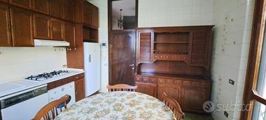 Cucina completa in noce composta da credenza indipendente 180x48x205H - Basi 270x60x90H scomponibile in due parti - Colonna frigorifero 70x60x210H - pensili 170+95x35x60H - sovra pensili 170+95x35x70H - sovra pensile frigorifero 70x60x80H - Tavolo tondo diam. 120 - 8 sedie. Elettrodomestici (cappa / lavatrice / frigorifero / forno) inclusi.