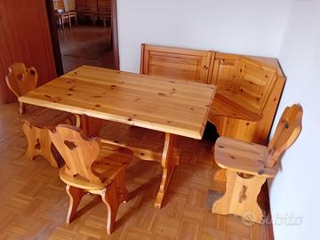 Cucina completa in pregiato legno di Abete chiaro, lunghezza 300, altezza 205, profondità 60 cm. Molto luminosa, pratica e funzionale con piano cottura a gas con 4 fornelli + forno elettrico, frigorifero con frezer. Conservata con estrema cura. Vendo la cucina a €.900 mentre il tavolo a 6 posti con panca e 3 sedie a €. 590.