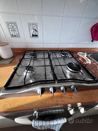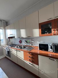 Cucina completa in legno e colori chiari. Forno Rex. Fuochi a gas. Lavandino e doppia vasca in acciaio. Cappa aspirante. Unico difetto una piccola macchia chiara sul top. Disponibile da fine novembre.