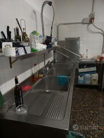 cucina completa di nr.3 lavandini, vari banchi e mensole, nr.1 frigo a colonna, nr.1 affettatrice, nr.1 tigelliera, nr.1 lavastoviglie a cappotta con scivolo, nr.2 banchi sportellati, nr.1 fabbricato del ghiaccio, nr.1 forno a convenzione 10 teglie, una 4 fuochi più una due fuochi, doppio bollitore, doppia friggitrice, abbattitore, griglia a gas, scaffali e mensole varie, posateria per cucina e teglie e varie, nr.3 cappe collegate al suo motore acquistato nuovo nel febbraio del 2021.