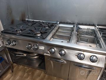 vendiamo attrezzature da cucina professionali per ristorante attualmente situate all'interno di un hotel. si vende per cambio destinazione d'uso della cucina. - griglia a gas doppia piastra - forno a convenzione 10 teglie a gas e autopulente in automatico con attacco acqua - 4 fuochi a gas - bollitore doppia vasca a gas visto e piaciuto e trasporto a carico dell'acquirente. per vendita in blocco prezzo trattabile.