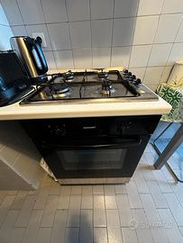 Cucina completa con lavandino, frigorifero, vano asciuga piatti, 3 comparti rialzati macchina del gas forno e frigorifero.