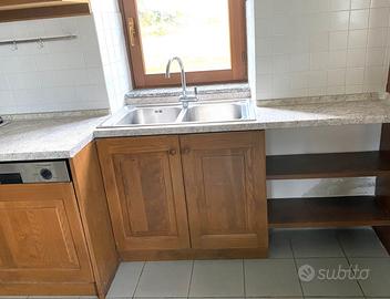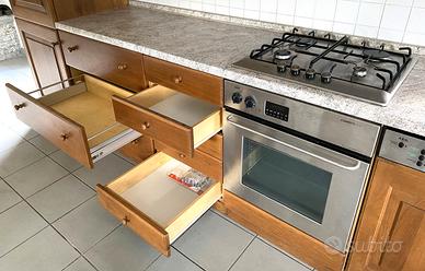 Cucina completa installata 14 anni fa ma utilizzata raramente. Condizioni ottime, priva di graffi o segni di usura. Lavastoviglie AEG e cappa Bosch richiedono minori interventi di manutenzione; il resto (lavello, forno AEG, frigo e piano cottura Bosch) è funzionante. La cucina si articola in 4 blocchi. 1. Frigorifero, freezer + antina in alto (230 x 55 x 50) 2. Blocco centrale con forno e lavastoviglie (90 x 45 x 200) 3. Antine + cappa. 4. Lavandino (90 x 55 x 80) Materiali: Ante e telai in legno massello. Pannelli ante in fibre di legno compattate. Piano di lavoro in HPL (High Pressure Laminate) materiale composito ad alta resistenza, antigraffio, resistente agli urti, e alle alte temperature Trasporto, smontaggio, e installazione non sono inclusi