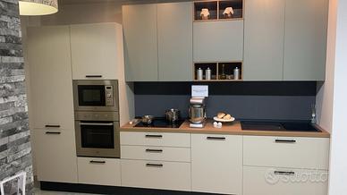 CUCINA COMPLETA LARGHEZZA 360 CM, CON ELETTRODOMESTICI MK CON COLONNA FRIGO CONGELATORE - COLONNA FORNO + MICROONDE - LAVASTOVIGLIE -PIANO COTTURA A INDUZIONE O A GAS PENSILI H. 96 CM, PIANO IN LAMINATO SP. 4CM.