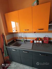 Cucina lineare più mobile con forno e dispensa, completa di tavolo allungabile e 4 sedie. Nella cucina sono compresi gli elettrodomestici ad eccezione del frigo e del piano di cottura. Cucina color wengė e alcuni sportelli arancione lucido. Piano in marmo. Cucina utilizzata solo per 2 anni. La cucina è smontata ed immediatamente disponibile. Il trasporto è a carico dell'acquirente.