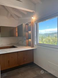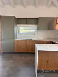 Montata in Aprile 2024, tra le varie caratteristiche: top Caranto, frigorifero maggiorato Electrolux da 75, piano induzione Electrux bianco da 90, cappa Falmec, lavabo FRANKE, tutta in legno rovere.