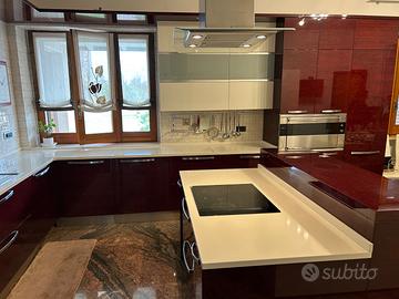 Cucina componibile con isola completa di un piano cottura a gas un piano cottura a induzione, un forno, una lavastoviglie e un frigo da incasso e due aspiratori per fumi