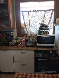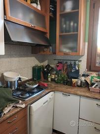La cucina è composta da due angoliere, lavandino doppio lavabo da sostituire perché in materiale bianco ormai usurato, cassettiera da 45, spazio forno o lavastoviglie posta sotto il piano cottura (compreso nella vendita) n.2 cassettiere da 60, con pensili a tutta altezza, scolapiatti da 90, cappa cucina.