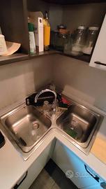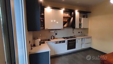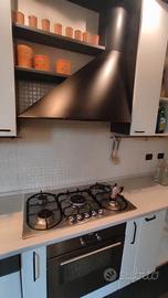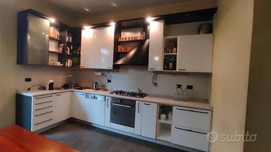 Cucina componibile Euromobil, angolare, completa di piano a 5 fuochi, forno, lavastoviglie e frigo. Dimensioni parte frontale lunghezza 282 cm, parte angolata lunghezza 151 cm, altezza mobili 88 cm, altezza pensili 110 cm. Vendo a 380 €