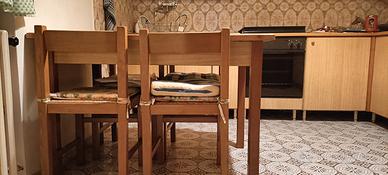 Cucina componibile angolare completa di elettrodomestici in laminato, forno Rex, piano cottura inox, lavello due vasche e gocciolatoio in inox , frigorifero con cella freezer. Incluso tavolo allungabile e quattro sedie.