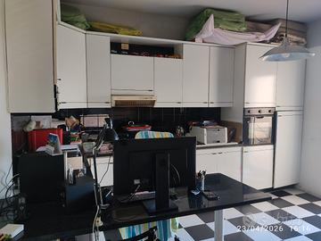 Cucina componibile con penisola. Piano di lavoro e piano tavolo in granito nero africa, spessore 3 cm. Elettrodomestici non funzionanti e PC con stampante non compresi nella vendita. Misure primo pezzo: 3,5 m di lunghezza e 2,38 m di altezza. Misure secondo pezzo: 90 cm di lunghezza e 2,38 m di altezza. Misure tavolo: 70 cm di larghezza 2 m di lunghezza e 80 cm di altezza. Prezzo trattabile. Smontaggio e trasporto a carico dell'acquirente.
