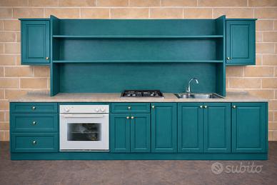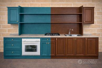 Cucina realizzata in legno massello con elegante finitura tinta noce in stile Arte Povera. Un arredo importante e scenografico, ideale per valorizzare la cucina come un pezzo d’impatto, pensato per chi desidera un mobile solido e di qualità, con il calore autentico del legno.