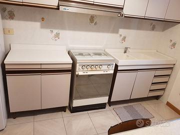 Vendesi cucina componibile datata, lunghezza 260 cm, ancora utilizzabile, composta da lavello in porcellana con mobile, forno con piastre a gas ed elettriche, altro mobile a 2 ante e 4 elementi pensili. In aggiunta tavolo con piano in formica.