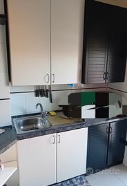 cucina componibile completa di piano cottura,forno, cappa con mensola ,top ,lavabo con miscelatore più vari pensili presenti in foto(i 2 mobili neri sono copri lavatrice e copri caldaia)incluse 3 sedie ed una panca nera salva spazio fatta su misura dal falegname.