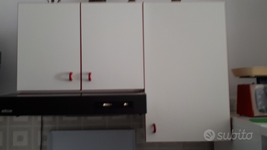 Cucina componibile in laminato bianco con profili rossi - tavolo e due sedie - mobiletti e pensili vari - cappa elettrica (Larghezza cm. 60)