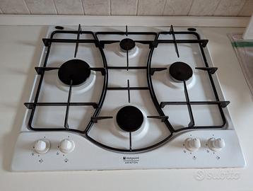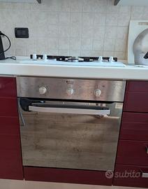 Cucina componibile con sportelli esterni in laccato bordeaux e bianco, struttura interna in laminato bianco. Lavello in fragranite con una vasca e gocciolatoio. Zoccolino colore acciaio. Comprensiva di miscelatore lavello, cappa aspirazione Flaminia, piano cottura a gas a 4 fuochi Hotpoint Ariston e forno Hotpoint Ariston con funzioni statico-ventilato-grill (anno 2015).