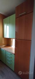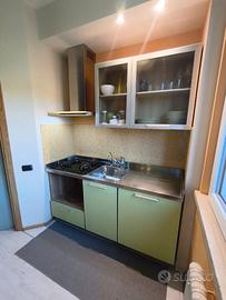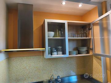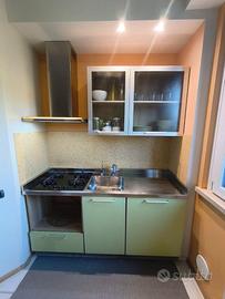 Cucina componibile Minotti completa di lavello in acciaio inox; piano cottura in vetro con 4 fuochi a gas; vano per forno da incasso con sottostante cassettone; vano sottolavello e vano lavastoviglie; vetrina pensile in alluminio e vetro smerigliato (105 cm); cappa aspirante in acciaio inox (60cm); base (120 cm) con vano e cassettiera e piano di lavoro in legno lamellare; colonna per frigo e congelatore + sovrastante vano; pensili (120 cm) alti 108 cm. Sviluppo totale della cucina 345 cm.
