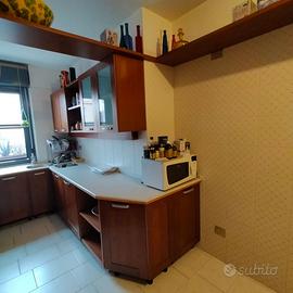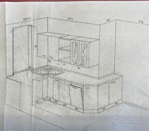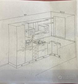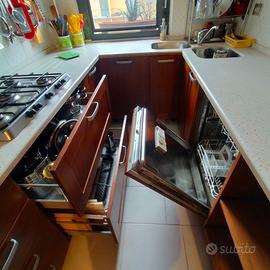 Cucina componibile Doimo color ciliegio con piano in corian, completa di forno, cappa, lavastoviglie (da riparare), piano cottura 5 fuochi, lavello doppio ad angolo. Misure come da progetto in foto. Smontaggio e trasporto a vostro carico. € 3500,00