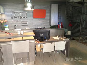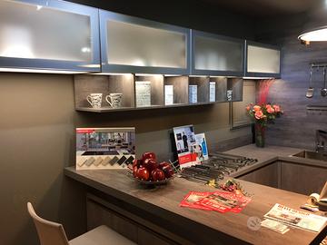 Cucina tedesca Wellmann marchio Alno, nuova da esposizione, ante melaminiche colore oxide calcestruzzo, top in laminato antigraffio spessore 40 mm. colore calcestruzzo, piano cottura Ariston Hot Point inox a gas 5 f., forno Ariston Hot Point termoventilato 10 funzioni pizza grill, lavastoviglie Ariston Hot Point classe A++ 14 coperti 11 programmi partenza differita, cappa Falmec in vetro color aragosta, lavello Franke inox