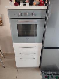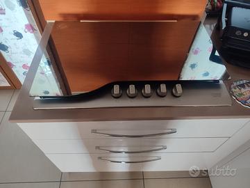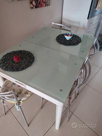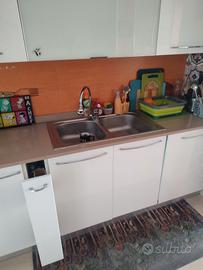 cucina componibile angolare, bianco lucido,con cassetti a chiusura rallentata, piano cottura a 5 fuochi sono compresi gli elettrodomestici tra cui la lavastoviglie praticamente nuova essendo stata sostituita da circa un anno. Tavolo allungabile in vetro satinato misura 120 x 90 chiuso + 4 sedie DIMENSIONE CUCINA 270cm x 160 cm più colonna forno separata ma volendo si può affiancare alla cucina misura 60 cm per altezza 150cm Il frigo non è compreso LA CUCINA SARÀ POSSIBILE RITIRARLA A FINE LUGLIO