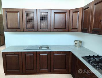 Cucina stile classico di mostra modello Grazia ditta Arrex Le Cucine. Misura 274 cm lato lavello x 349 cm lato frigo, quindi totale poco più di 6 metri!! Tutti gli elementi vengono spostati ed adattati alle vostre misure grazie ad un top in laminato sp. 4 cm incluso nel prezzo ancora da tagliare e forare. Tutte le ante a telaio sono in legno color noce americano. Lo zoccolo H12 cm è dello stesso materiale. Gli elettrodomestici inclusi sono i seguenti: - frigorifero 320 lt lordi con freezer a 3 cassetti (è possibile creare una dispensa togliendo il frigo); - forno ventilato multifunzione; - piano cottura 5 fuochi inox; - cappa ad incasso; - lavello una vasca + scivolo inox. La lavastoviglie non è inclusa ma c'è la predisposizione. Sono disponibili diversi modelli di occasione (fino ad esaurimento scorte). Effettuiamo trasporto e montaggio con prezzo da calcolare in base ai km ed al piano della casa. Possibilità di finanziamento. Andrea