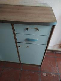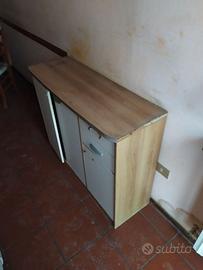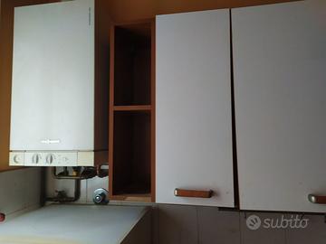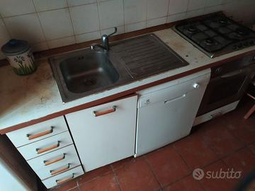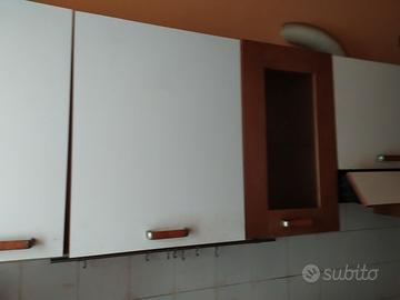 Basi e pensili cucina inclusi frigo e cappa. Alcune parti in legno danneggiate (cerniere e parti del top in truciolare) Altri elettrodomestici (forno, piano cottura, lavastoviglie, ) non inclusi. Smontaggio e trasporto a parte.