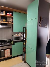 cucina componibile con elettrodomestici quali forno,piano cottura,frigo e lavastoviglie,il piano lavoro è in granito nero e il rivestimento delle ante e laccato verde come da foto