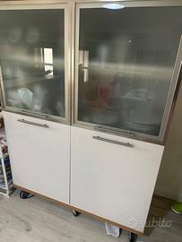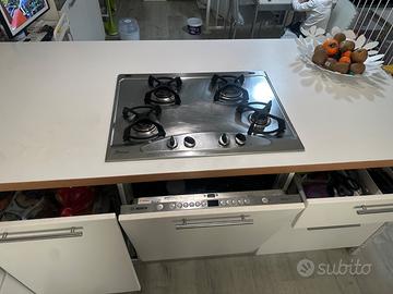 Cucina con bancone penisola in ottimo legno, base lavabo, lavandino, mobile laterale, cassetti estraibili anche con 2 estrazione come da foto, pensili cucina, dispensa cucina, frigo e microonde. Tutto in buono stato e ottimo materiali. Vendiamo per cambio cucina.