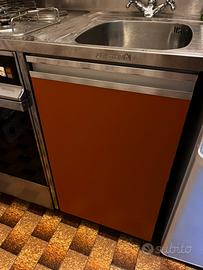 Cicina arancione composta di tre pensili (di cui uno scola piatti) e un mobiletto in basso sotto il lavandino. Cucina a gas con tre fuochi ed una piastra e con forno. Lavello con una vasca ed uno scolatoio. In piu due mobiletti bianchi (un pensile ed uno in basso). Non regalo il frigo xé lo utilizzo ancora. Smontaggio e trasporto e vostro carico.