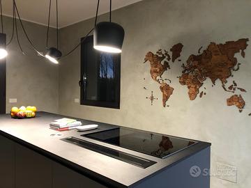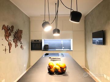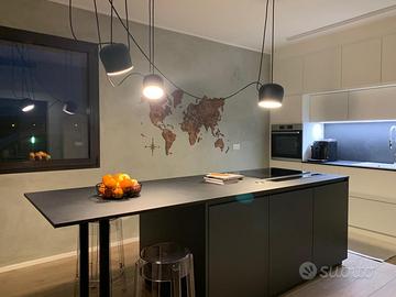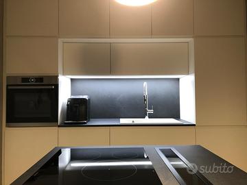 cucina di falegnameria realizzata su misura, composta da moduli a parete 285x255 con frigo Siemens, e lavabo Plados con miscelatore incluso; laccato opaco RAL 9010 con piano in laminato effetto pietra. Isola 275x95 con basi e piano snack a sbalzo: piano cottura induzione Siemens e cappa aspirante Elica. Laccato opaco grigio antracite con piano in laminato effetto pietra. Tutti i moduli sono di dimensioni standard ed assemblati per raggiungere le dimensioni richieste dagli spazi. Ottimo stato, solo piccole sbeccature nella zona sedute dell'isola. Disponibile da Maggio 2026.