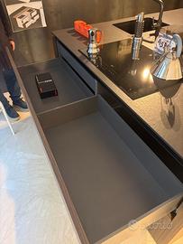 Cucina con Isola Quadrata Meson’s Goccia – SCONTO 55% Eleganza contemporanea e design senza tempo si incontrano nella cucina Meson’s modello M2 Goccia, caratterizzata dall’iconica presa di apertura che definisce lo stile del marchio. La particolare gola crea un raffinato effetto di leggerezza e sospensione tra basi e top, donando alla composizione un’estetica pulita e armoniosa. Il recente restyling del modello valorizza ulteriormente questo dettaglio distintivo: la gola presenta ora linee ancora più essenziali e decise, migliorando al tempo stesso la praticità d’uso e la facilità di pulizia. La composizione proposta include isola quadrata centrale e colonne, per una cucina di grande impatto estetico e perfettamente funzionale, ideale per ambienti moderni e spazi open space. Materiali Ante basi e isola: Noce cotto Top: Dekton Black Colonne: struttura in Grigio Fenix con ante in noce cotto Elettrodomestici inclusi Lavastoviglie AEG Frigorifero AEG Piano cottura a induzione AEG Lavello Franke MRG 110-52 Rubinetto Franke Urban Tutti gli elettrodomestici sopra indicati sono inclusi nel prezzo. Dimensioni Isola: L 180 × P 180 × H 89,8 cm Colonne (cad.): L 75 × P 60 × H 242 cm Prezzo di listino: € 29.200 Offerta con SCONTO 55% Siamo rivenditori ufficiali Meson’s. Per ricevere un preventivo personalizzato, potete inviarci: planimetria della cucina foto dell’ambiente indirizzo di consegna Grazie al supporto dei nostri architetti e progettisti, possiamo aiutarvi a progettare la cucina più adatta ai vostri spazi. Disponibili servizi di consegna e montaggio anche all’estero.