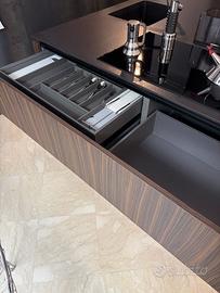 Meson’s Mod. M2 Goccia La presa di apertura di Goccia è tra i segni maggiormente caratterizzanti lo stile Meson’s. L’effetto di leggerezza e sospensione che crea tra basi e top, è alla base della capacità di questo progetto di attraversare il tempo senza perdere nulla in termini di equilibrio estetico. Un accorto restyling aggiunge ora alla gola un carattere ancora più deciso e pulito. Caratteristica alla quale si aggiungono una presa più comoda e una pulibilità ulteriormente semplificata. Cucina con isola e colonne Materiale: Ante: Noce cotto - Top: Black Dekton - Colonne: Struttura: Grigio Fenix - Ante: noce cotto Elettrodomestici inclusi: - Lavastoviglie Aeg - Frigo Aeg - Piano cottura ad induzione Aeg - Lavello Franke MRG 110-52 - Rubinetto Franke Urban Il prezzo include gli elettrodomestici sopra elencati Dimensioni: Isola L 180 x P 180 x H 89.8 cm / Colonna cadauno L 75 x P 60 x H 242 cm Prezzo di listino € 29200