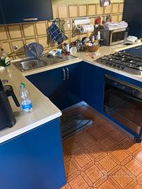 Compreso di piano cottura a gas Ariston, Lavabo in acciaio con cassetti sottostanti e pianale adiacente lavabo, due cassettoni sospesi a parete, sei cassetti, e zona dispensa e frigorifero ad incasso. Con Cappa compresa e tavolo a penisola larghezza 76 cm lunghezza 120 cm.