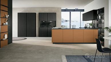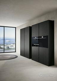 Il vano laterale da 15 cm, in finitura Laccato Nero Lucido, permette, grazie all’abbinamento ai forni con estetica nera, di esaltare lo sviluppo della composizione e dona importanza agli elettrodomestici.