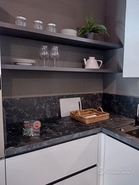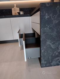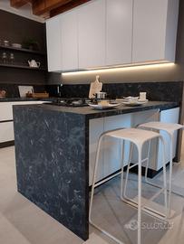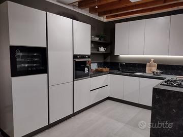 Cucina componibile ad angolo con penisola misura 340(parete colonne)x317(parete lavello)x188(lato penisola)h.216/240 cm, zoccolo h.12 cm e profilo gola per l'apertura tutto in finitura antracite. La cucina è in finitura laccato opaco bianco. I pensili sono h.96, compreso scolapiatti inox da 90cm. Piano di lavoro in laminato unicolor HPL spessore 4 cm. colore nero marquinia. Compresa alzata h. 28 sp. 2 cm finitura come piano di lavoro. Cassetti e ante con chiusura ammortizzata. Elettrodomestici inclusi marchio Hotpoint sono: lavastoviglie incasso da 60cm, frigocongelatore combinato 320 lt ad incasso e forno multifunzione. Il piano cottura è a gas in vetro modello Franke. E' presente anche cantinetta vini ad incasso nella colonna marchio Dunavox. Lavello Franke una vasca in Granitek colore nero con miscelatore colore nero e acciaio. Accessorio sottopensile con mensola portaoggetti, portacoltelli, portarotolo e ganci in metallo verniciato nero compreso. Compresi sono anche due sgabelli colore bianco come da foto. Illuminazione led incluso. Cappa esclusa. Cucina nuova di esposizione prezzo listino 20.600 proposta in offerta a €8800. Trasporto e montaggio esclusi, qualora fossero necessari questi servizi possiamo quotarli. Se interessati è visionabile e/o possiamo inviare altre foto. Siamo disponibili per dare ulteriori informazioni anche telefonicamente al numero 0424560526