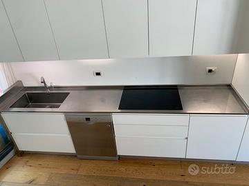 Cucina completa bianco satinato 366 cm + modulo 120 cm. Piano acciaio inox Foster pezzo unico con lavello integrato di 70x40 cm.