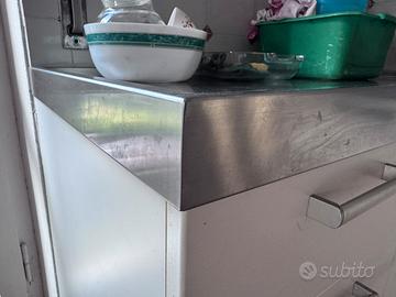 Ottima cucina molto resistente con piano angolare in acciaio inox in pezzo unico, senza saldature o giunzioni. Pagata 4000 euro om quanto si misura usata pochissimo nella taverna che stiamo ristrutturando. Misure 150 lato lungo, 120 quello piu corto, profondita 60. Con scolapiatti cassetti. Mobile molto resistente di alta qualità. Ritirabile a Sestri Levante