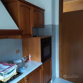 Cucina in legno colore noce e ripiano in marmo, con forno e lavastoviglie. Pensili completi di cappa. Completa di tavolo con 4 sedie
