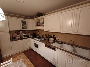 valuto offerte per la cucina in foto con lavastoviglie, frigo, fuochi, lavello, tavolo in marmo sedie.
