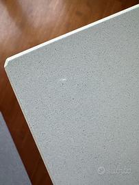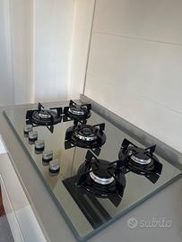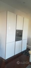 Cucina mobilturi modello stratos, ante in vetro bianco , gola inox ,lunga 240 cmx60cm + 3 colonne 60cmx60 cm + isola 166cmx100cm. 5 fuochi vetro temperato argento , lavello 1 vasca 78xcmx 51cm franke, forno argento con 8 funzioni, 2 sgabelli Piano in quarzo grigio chiaro. L’isola può diventare eventualmente un componente di estensione della cucina o madia.