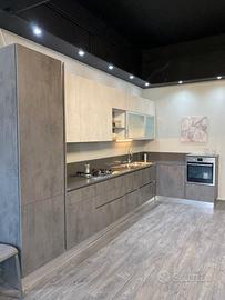 Cucina modello Tablet neck, ante in laminato effetto pietra L 430x185cm con gola H 241cm top in agglomerato di quarzo Silestone Grey con schienale 20cm