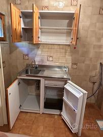 Blocco lavello + mini frigorifero con pensile in legno e scolapiatti.